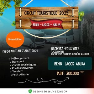 2. Circuit Bénin-Lagos-Abuja : Cette ligne offre un tarif unique de 300 000 F CFA, incluant le transport en avion, l’hébergement, les visites de sites, les photos souvenirs, le T-shirt et le petit déjeuner.