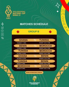 16 pays participeront à cette CAN de mini-football Derna 2025 en Libye. Le Bénin est logé dans le groupe B avec la Tunisie, le Ghana et le Maroc. Dans ce groupe B, le Bénin joue :