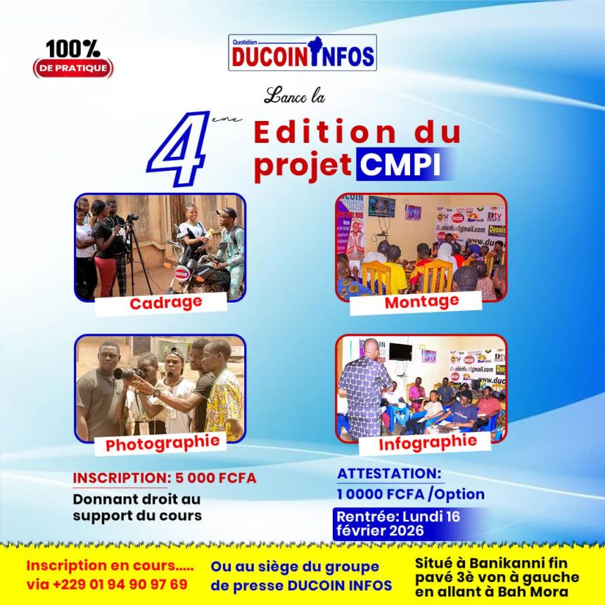 Le domaine de l’audiovisuel et de la communication visuelle poursuit son évolution constante. À Parakou, le groupe de presse DUCOIN INFOS se place à l’avant-garde en offrant aux jeunes une occasion exceptionnelle de renforcer leurs compétences. Fidèle à sa vocation formatrice, le média ouvre les inscriptions pour la 4ᵉ édition de son programme d’initiation en CADRAGE-MONTAGE et PHOTOGRAPHIE-INFOGRAPHIE (CMPI).