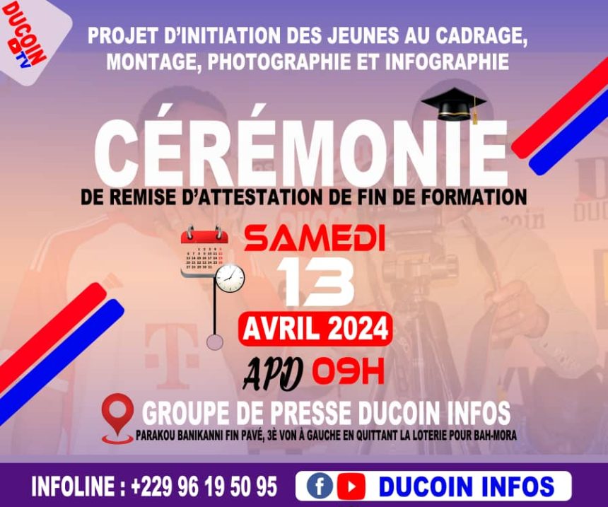 La cérémonie de remise des attestations se déroulera au siège du Groupe de Presse DUCOIN INFOS situé à Parakou au quartier Banikanni fin pavé dans la troisième Von à gauche en quittant la salle de jeux de la loterie nationale pour le quartier Bah-Mora, à 9h00. Prenez donc le rendez-vous.