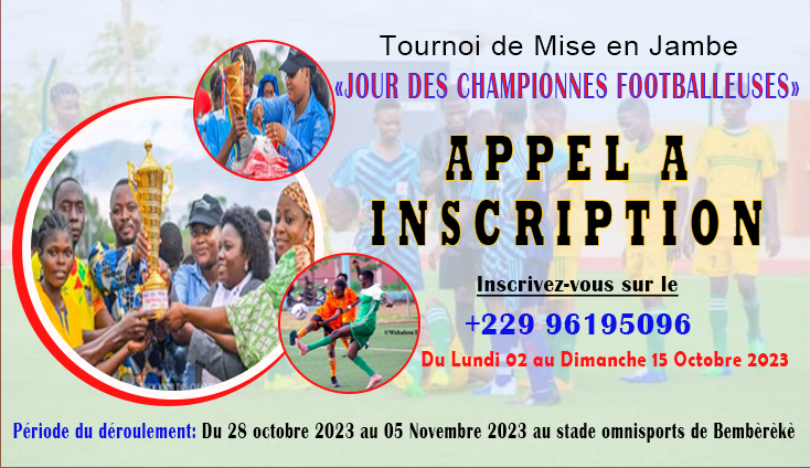 Les inscriptions se font sur WhatsApp ou par messagerie électronique sur le +229 96195095 (Nom du club, nom d’un responsable+son numéro). Le tournoi démarre le 28 octobre 2023 et prendra fin le 05 Novembre 2023, soit une semaine de mise au vert pour permettre aux clubs féminins de mieux aborder la saison 2023-2024.