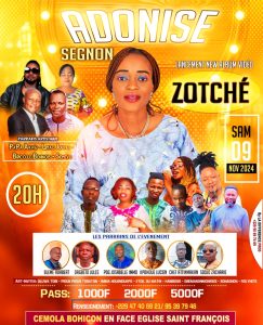 L’artiste béninoise Adonise Sègnon s’apprête à dévoiler son nouvel album vidéo intitulé « ZOTCHÉ » lors d’un événement très attendu. Ce lancement aura lieu le samedi 9 novembre 2024, à 20h, au CEMOLA de Bohicon, en face de l’église Saint François. Pour cet événement, Adonise peut compter sur le soutien de plusieurs parrains artistiques de renom, tels que Papa Akwê, Limac Jouvet, Brico le Béninois et Sèmevo, qui apporteront leur expérience et leur notoriété à cette célébration musicale.