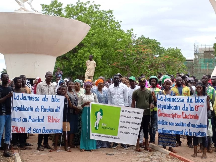Le samedi 08 Juin 2024, les jeunes militants du parti Bloc Républicain et notamment de la coalition Amis du Ministre d’État Abdoulaye Bio Tchané ont renouvelé leur soutien au Président Patrice Talon et à tous les membres de son gouvernement. La déclaration de soutien lue par le Président Ahmed Salim Nouhoun à la place Bio Guérra à Parakou, a mis un point d’honneur sur le bilan de la rupture de 2016 à nos jours. Conseillère Municipale et membre du bureau politique communal du parti du cheval blanc à Parakou, Madame Adiza Arouna a salué le courage des jeunes et leur engagement à vulgariser les actions du gouvernement. Elle a surtout rappelé aux jeunes le projet Azoli et son importance pour la lutte contre le chômage. Lire la déclaration de soutien des jeunes BR Amis du Ministre Bio Tchané.