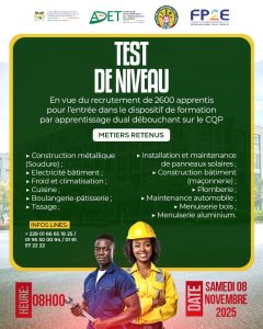 Les 202 candidats présents représentaient une diversité de métiers essentiels au développement économique du pays. Selon Claude Homagnon AMIGBATIN, Chef du Centre EFMS de Parakou, <<les électriciens bâtiment, les soudeurs, les plombiers, les pâtissiers-boulangers, les maçons, les opérateurs de froid et climatisation et les installateurs et maintenanciers des systèmes solaires et photovoltaïques>> ont pris part à ce test et ont été soumis à trois épreuves à savoir : la <<communication écrite, la lecture et la mathématique>>, précise Claude Homagnon AMIGBATIN. Ces épreuves, d’une durée totale de deux heures, ont été adaptées aux différents niveaux d’études des apprentis. <<Il y a des candidats du niveau CM1, de CM2 et de la classe de 4e >> souligne-t-il, démontrant ainsi l’accessibilité de ce test à tous les profils. Ceci représente bien plus qu’un simple test de niveau, il constitue une étape déterminante dans le parcours de formation technique et professionnelle des candidats. Il leur ouvre les portes d’une reconnaissance officielle de leurs compétences et d’une meilleure insertion sur le marché du travail.