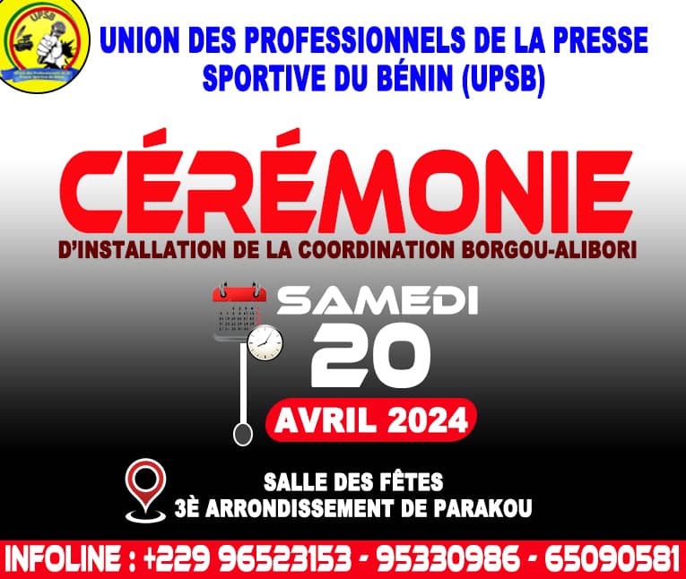À travers un communiqué, le service média de la coordination Borgou-Alibori de l’UPSB a informé l’opinion publique de la tenue de la cérémonie qui consacrera, l’installation des membres. Ladite cérémonie est annoncée pour le samedi 20 Avril 2024 à 9h dans la salle de conférence du troisième arrondissement de Parakou sise au quartier Tranza, en face de l’agence Moov.
