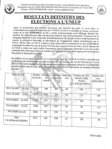 Le renouvellement des instances dirigeantes de l’Union Nationale des Étudiants de l’Université de Parakou (Uneup) a eu lieu le jeudi 17 avril 2025, avec les votes. Les résultats finaux, publiés le mercredi 23 avril 2025 par la Commission Électorale Universitaire Autonome (Ceua), ont confirmé le succès de la liste « Vision Unis pour l’Excellence ». Selon la commission, la liste « Vue » a remporté les élections avec 994 voix, soit 54,22%, tandis que la liste « Ensemble » a obtenu 839 voix, soit 45,77%.